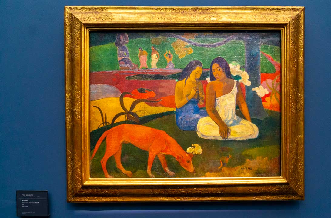 • Quadro Arearea ou Joyeusetés, de Paul Gauguin (salas 38-40): exemplar do pós-impressionismo, essa tela de 1892 retrata duas mulheres e um cachorro na ilha de Taiti, na Polinésia Francesa
